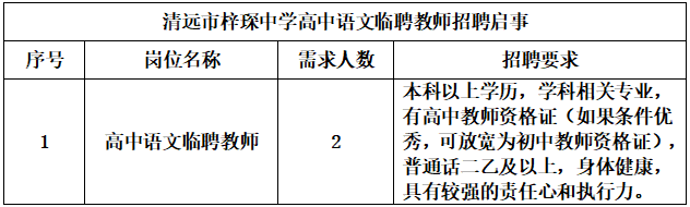 清遠市梓琛中學急聘高中語文臨聘教師